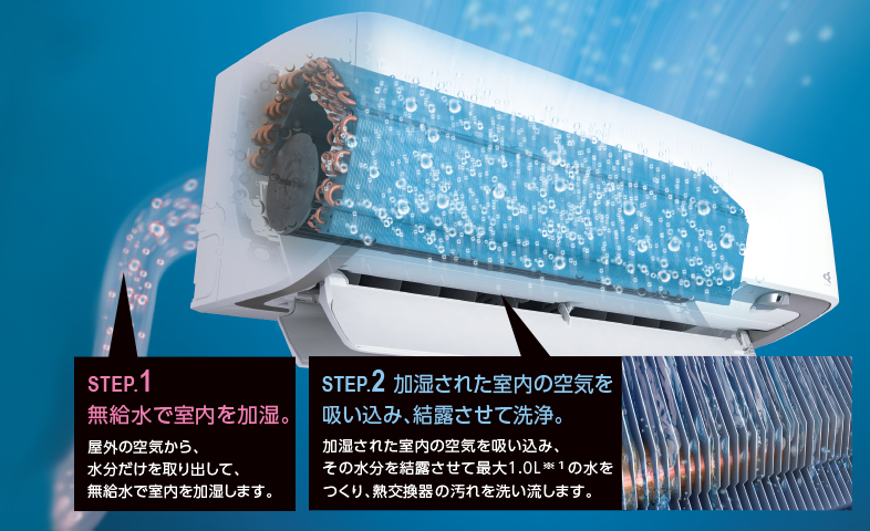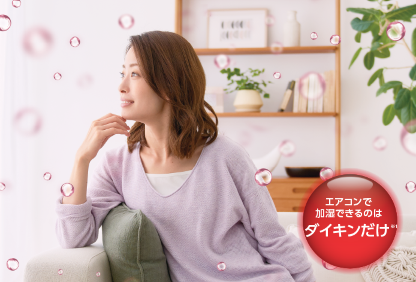 外の空気中の水分をエアコンが取り込み、無給水で冬のお肌・お部屋にうるおいをお届け。無給水加湿は、ダイキンだけの技術です。