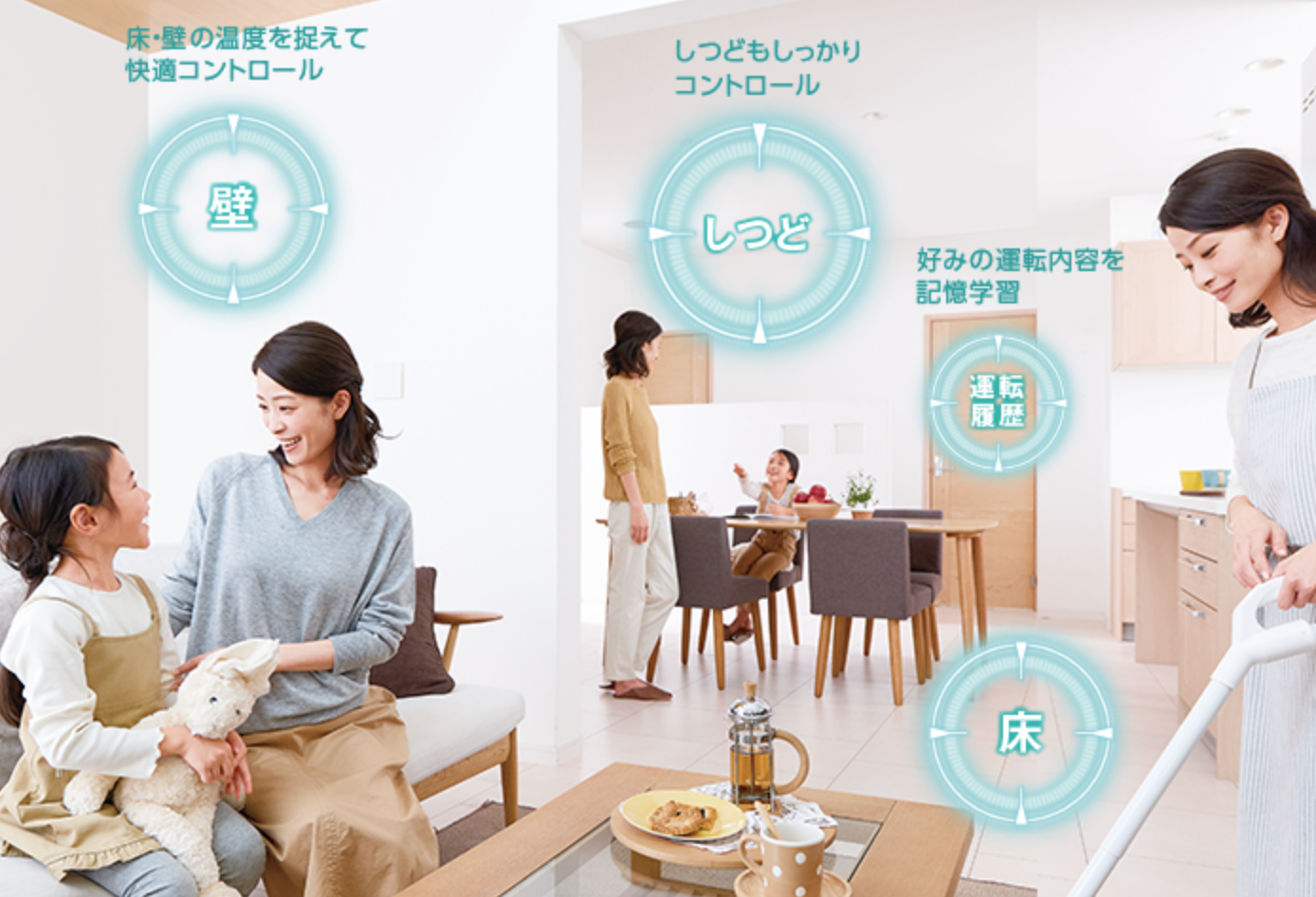 床・壁温度を検知して、輻射熱を推測。内容を判断し、ダイキン独自の加湿コントロールと合わせて、空間全体が快適な自動運転を行います。