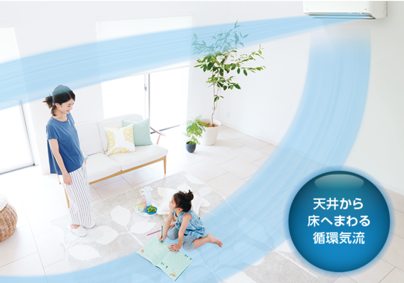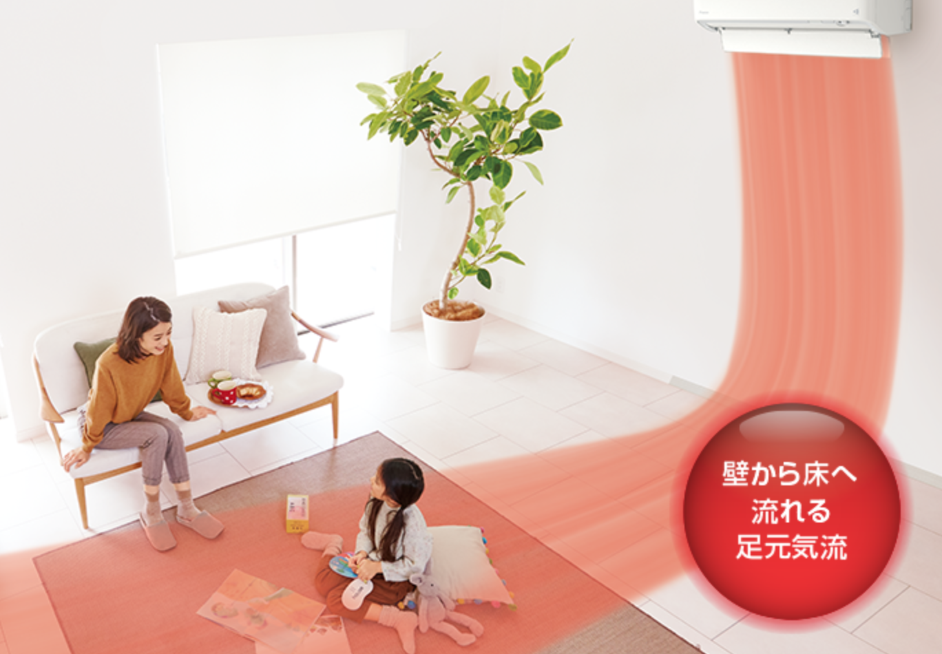 床面から温もりが広がる垂直気流で、風を感じにくい快適空間をお届けします。暖房の立ち上がりスピードもアップしました。