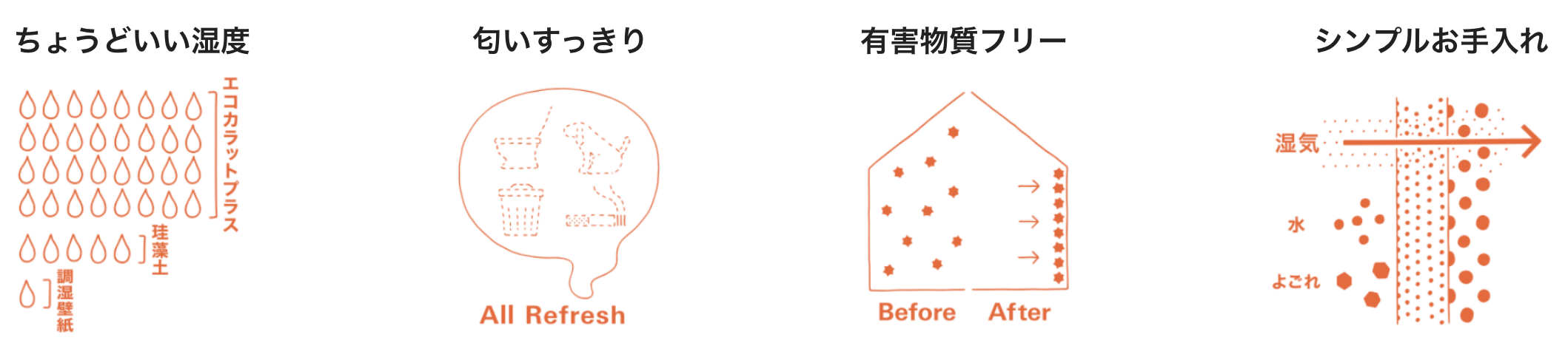 エコカラットは素材の微細な孔が自然に湿気を吸ったり吐いたりすることで、電気などのエネルギーを使わず、カラッと快適にすごせます。