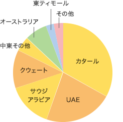 LPガスの原料は原油や天然ガス。これらの中にある不純物を取り除いて生産されます。日本で使うLPガスは、約80%を海外から輸入しています。その大部分はカタール、UAEなどの中東諸国やオーストラリアのガス田で採掘されています。また、輸入以外の20%は日本の製油所で生産されたものですが、その元になる原油もやはり輸入しているので、結果として99%以上を海外に頼っていることになります。今後はシェールガスをはじめ新たなガス田からの生産が期待されています。