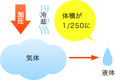 本来常温で気体となっているガスをそのまま運ぼうとすると、莫大な物流コストがかかってしまいます。その効率を高めるために開発されたのがガスを加圧・冷却して液化する方法で、その結果できあがった製品がLPガスです。処理後には体積が約250分の1と小さくなっているため、運搬もラクラク。産出国で専用の低温タンカーに積みこまれ、一度にたくさんの量が日本のターミナルまで輸送されます。